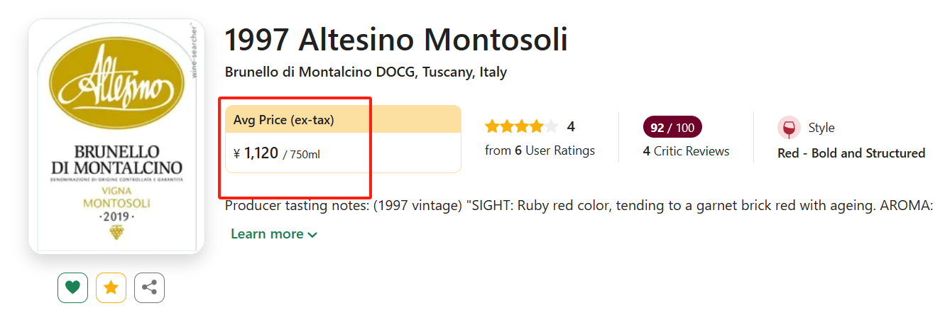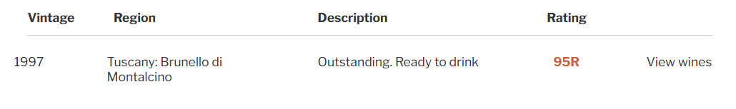 1997是Montalcino产区的大年,该年份获得了WA年鉴95分Outstanding的高评价!