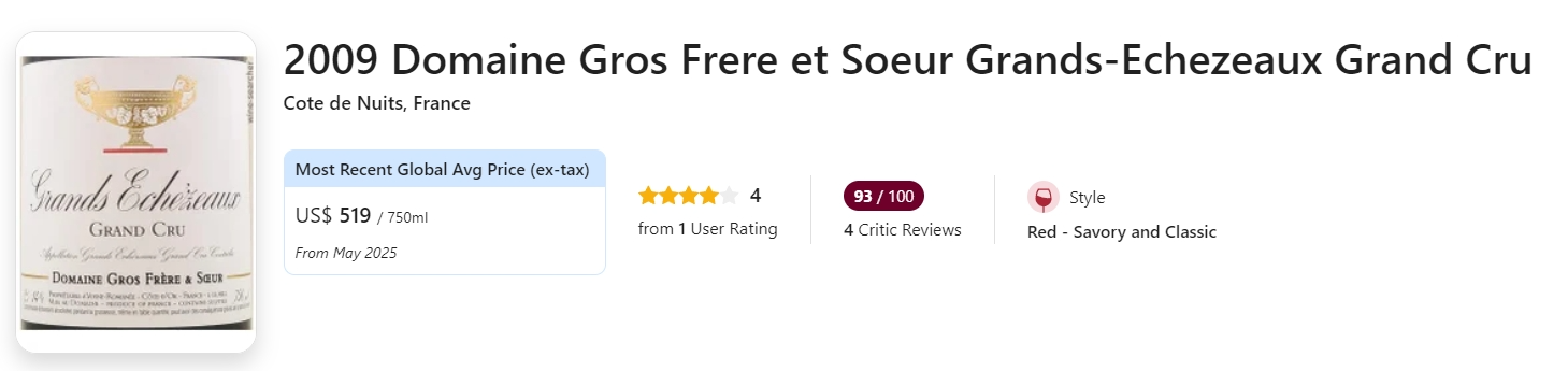 【国均9.4折!传奇“大金杯”,大年大依瑟索特级园!】Domaine Gros Frere et Soeur Grands-Echezeaux Grand Cru 2009