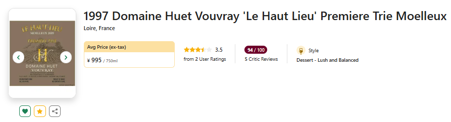 【国均8折!《世图》力荐,老年份“一级精选”单一园甜白!】Domaine Huet Vouvray 'Le Haut Lieu' Premiere Trie Moelleux 1997