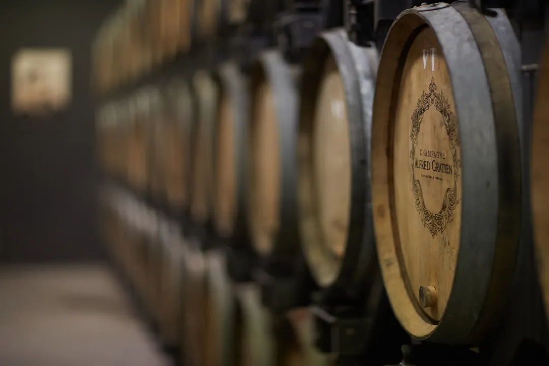 *用桶专家:普通香槟多采用不锈钢罐发酵。Alfred Gratien只使用夏布利228升旧橡木桶(酒庄存有千余只,单桶标注果农姓名与地块代码),同时避免新桶木质味干扰风土本真。