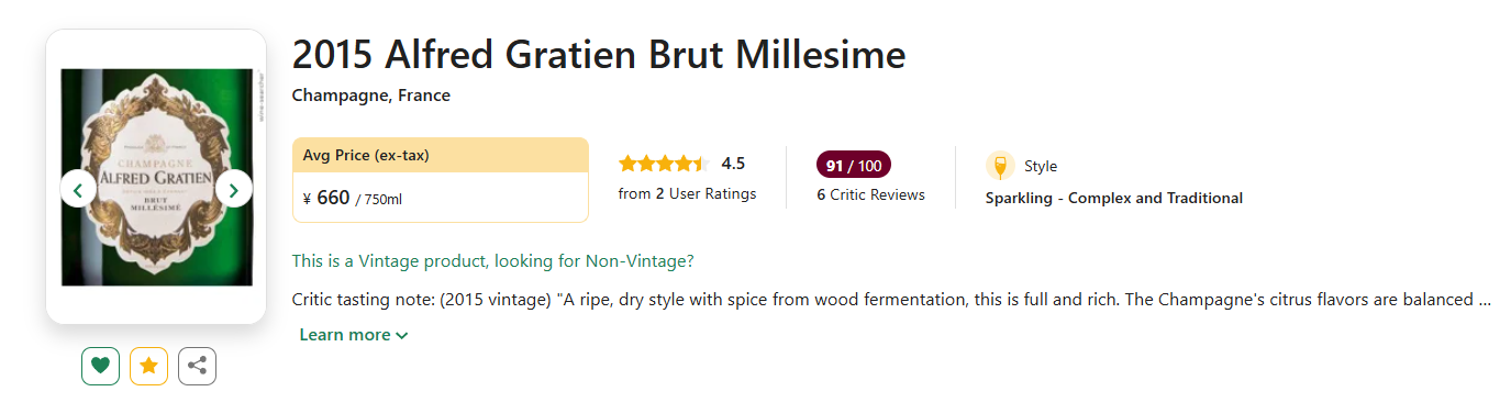 本次带来2015年份的Millesime,香槟好年,酒款斩获WS 94高分好评!除渣日期2023年2月,新鲜好饮!