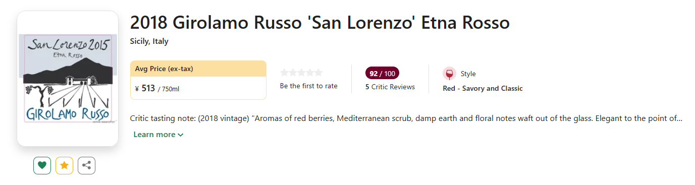 精彩呈现出Etna火山土壤特色,酒香复杂而细腻,醒酒数小时后的变化更加令人惊喜!