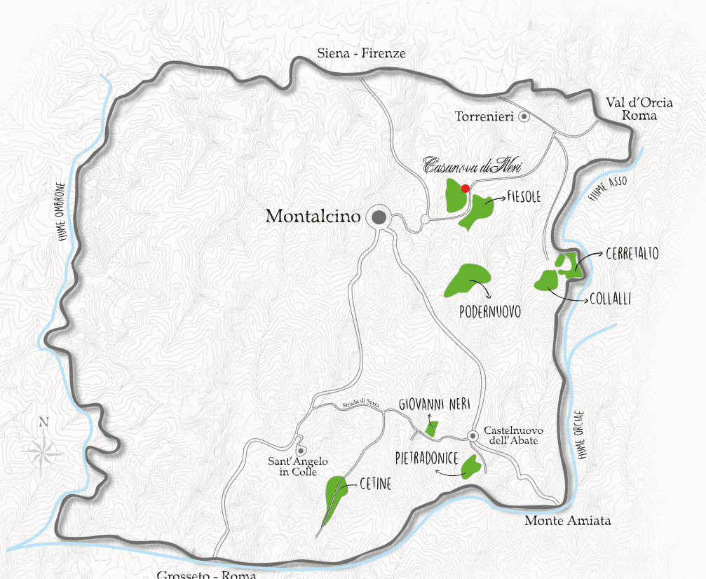 Giacomo Neri 在1994年购买了 Pietradonice 葡萄园。它位于蒙塔尔奇诺东南部,这里以前是一个古老的缟玛瑙采石场。土壤富含岩石以及大个头的砾石透镜体(白透明晶体),可以很好地吸收光照,保持土壤的温度。