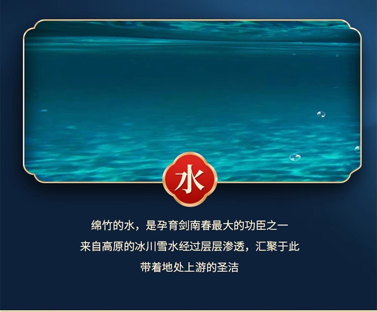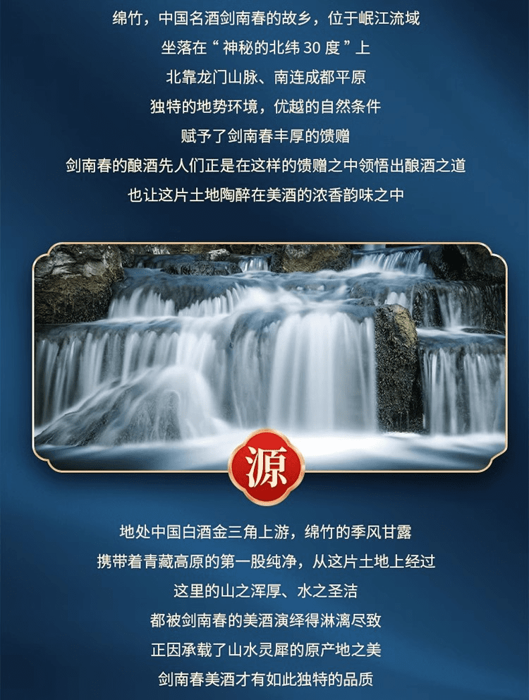 背靠龙门山,剑南春酿酒用水来自于珍稀地下深层矿泉水,是用雪水渗析矿泉酿造的名酒。川西平原沃野千里、作物繁茂,剑南春以“高粱、小麦、大米、糯米、玉米、大麦”为原料,精选颗粒饱满、滋味醇厚的优质粮食,发挥不同粮食的独特优势,十里挑一只取酿造精华,成就正宗浓香品质。“剑南春酒传统酿造技艺”入选国家级非物质文化遗产,传承千年的古法技艺和精益求精的匠心坚持,成就千年如一品质。