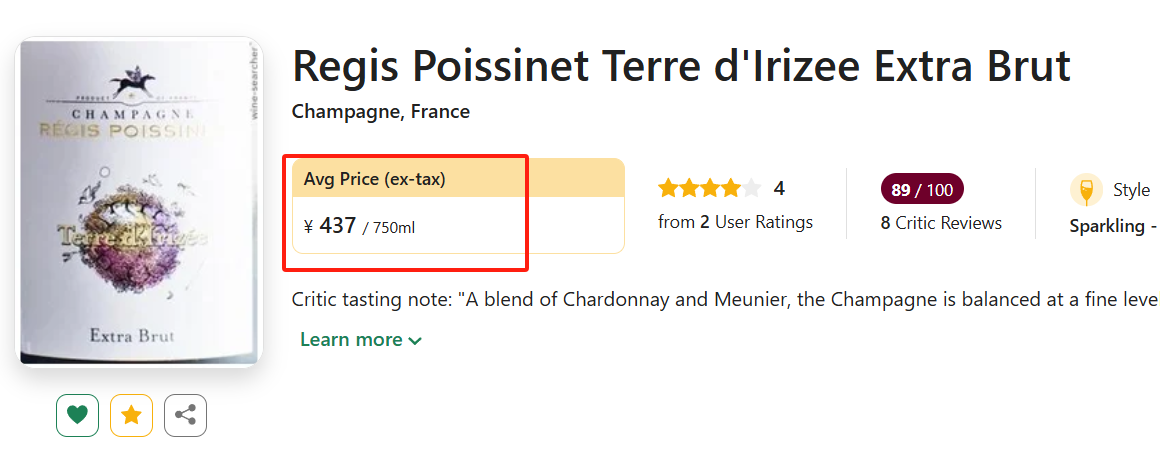 Regis Poissinet就是其中一家专注莫尼耶品种的香槟庄,树龄全都在40年以上。这款Terre d'Irizee虽然只是酒庄基础款,却使用了将近一半的陈年基酒做混调,带酒泥陈酿30个月后装瓶,补糖仅2g/L,以表现更自然地花果香调。
