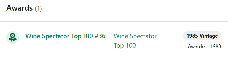 1985珍稀老年份不仅斩获JL & Vinous 96高分大赞,更荣登1988年WS 百大第36名!饮藏皆宜,老饕酒柜必入!
