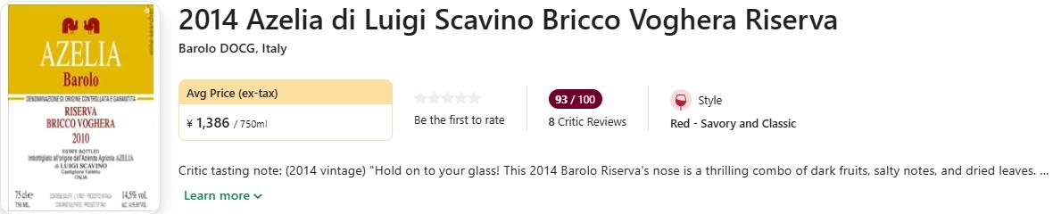 AG的酒评词也不吝赞美之词:2014年份的Riserva Bricco Voghera是我品尝过的Azelia酒庄最令人沉醉的Barolo之一。这款酒甜美馥郁、芬芳诱人,既保有惊艳的内在香气与甘美口感,又兼具丝绸般顺滑的单宁。红莓与紫罗兰浆果的甜香交织着薄荷、血橙及辛香料的层次,赋予其非凡的层次复杂度。Scavino家族当年敢于推出这款珍藏版的勇气,最终换来了一款堪称史诗级的Barolo!这个年份的表现简直惊艳绝伦——真乃琼浆玉液!