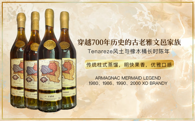 【又薅到了!珍稀老年份雅文邑,售完无补!】ARMAGNAC MERMAID LEGEND 1980、1986、1990、2000 XO BRANDY