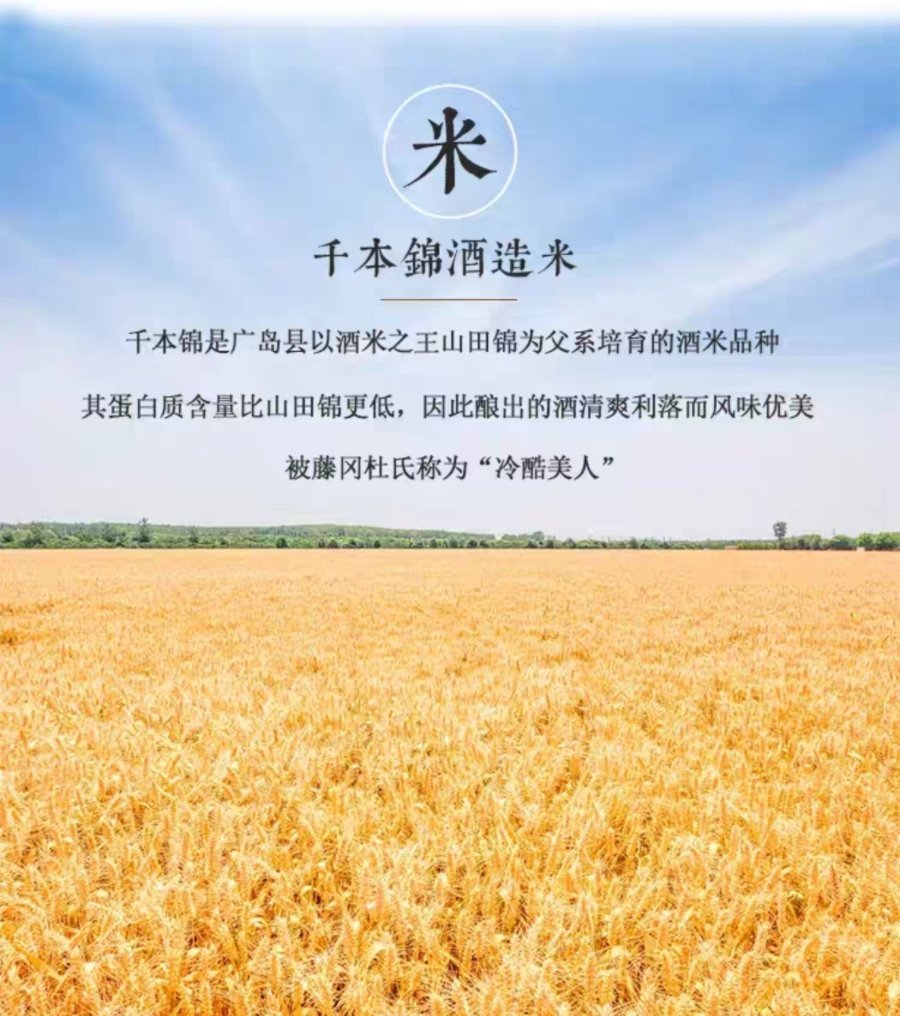 “千本锦”系广岛本地产酒造好适米,血统高贵,是酒米之王“山田锦”和另一优秀酒米“中生新千本”培育而来的品种。“千本锦”在平成8年(1996年)一经问世便好评如潮,于平成12年(2000年)作为广岛县骄傲开始批量生产。它继承这两种优质酒米优点的同时,更渐渐展露其独特的优势。(“中生新千本”具有适度的甜味和黏性,直接食用也甚为美味。虽然很少出现心白,但由于蛋白质含量低,所以它经常被用作酿酒。)