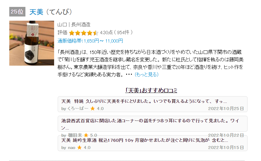 2022年10月26日,日本权威清酒机构Saketimes发布了全国清酒排名(全国の日本酒ランキング),位于山口县的长州酒造排名第25位,并且在山口县中排名第三位,超越了拥有清酒“拉菲”之称的獺祭(第四位)……