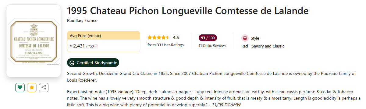 【低均130+!超二女爵正牌,准满分老年份!】Chateau Pichon Longueville Comtesse de Lalande 1995