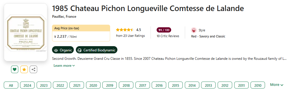 【低均好价!WS百大第17,80年代女爵正牌!】Chateau Pichon Longueville Comtesse de Lalande 1985