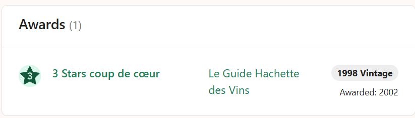 1998伟大老年份不仅斩获WA & JA 两大满分、TWI 99、JL & JD 98、BD 19.5、RVF19等名家超高分,还有阿歇特指南3星最高荣誉!老饕酒柜必入!