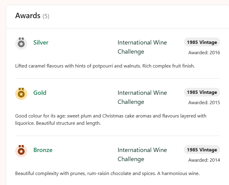 恰逢产区 WS Excellent大年加持,1985珍稀老年份斩获Vinum 18.5、RA 96、WA 95等诸多超高分好评,更有IWC 金奖背书!