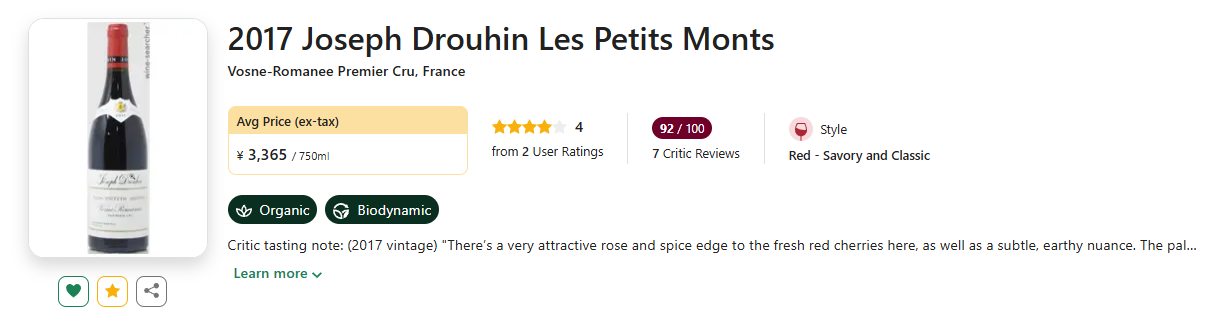 【低均近400!勃艮第百年名家,优年VR塔尖一级园!】Joseph Drouhin Les Petits Monts Vosne-Romanee Premier Cru 2017