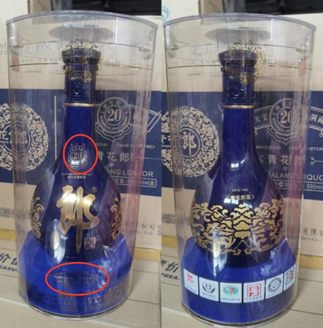 酒厂在2018年更新了第四代,颈部标识从数字20取消,变更为图案“青花郎麦粱标”(一边是小麦,一边是高粱环绕),现已升级到第五代了。