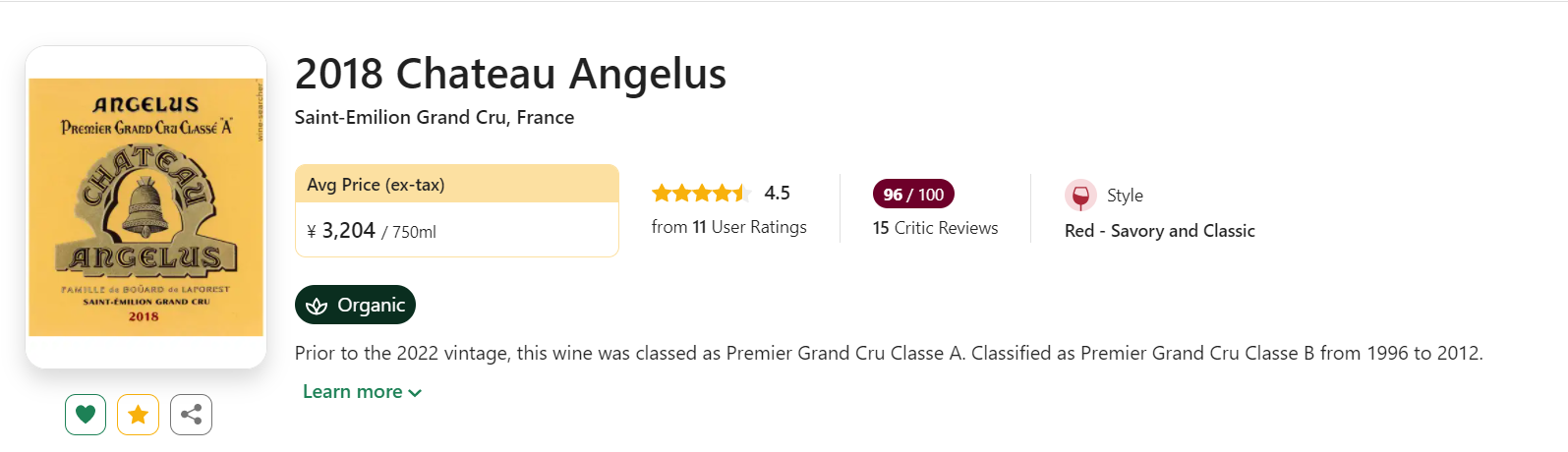 “Chateau Angelus是St. Emilion地区所生产的可以排行前四的醉佳酒品之一。”——Robert Parker