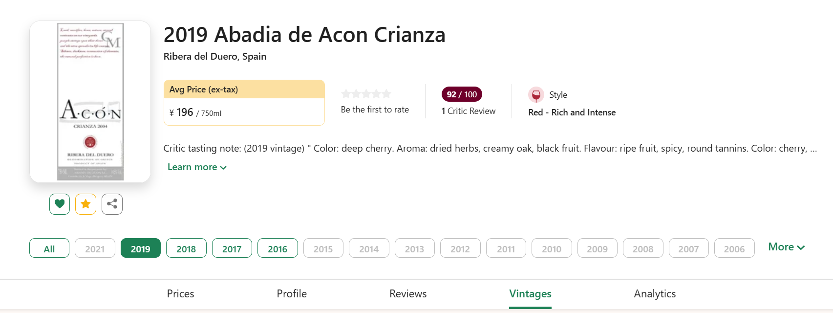 咱们今天这款就是Crianza级别,在上市前需至少窖藏两年,其中一年在橡木桶中熟成。深沉的樱桃红色,浓郁的成熟红色水果香气,伴随香草和甘草的辛辣味道,果香浓郁,结构良好,单宁优雅,口感丰富,回味悠长。
