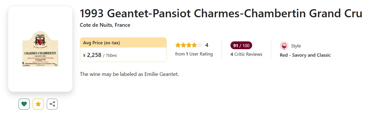 RP:这款Charmes-Chambertin令人惊叹,呈现出饱和的红宝石/紫色酒体,拥有卓越的浓缩度、出色的成熟风味(这是许多1993年份酒所不具备的特质),酒体中等至饱满,余韵悠长且风味富饶。新橡木桶带来的烤面包与香草香气清晰可辨,但这款醇厚浓郁的佳酿中仍充盈着充沛的黑皮诺果香……与许多单宁艰涩、口感空洞且缺乏层次感的1993年份勃艮第红葡萄酒不同,Geantet-Pansiot的作品完全规避了这些问题(1995年评)。