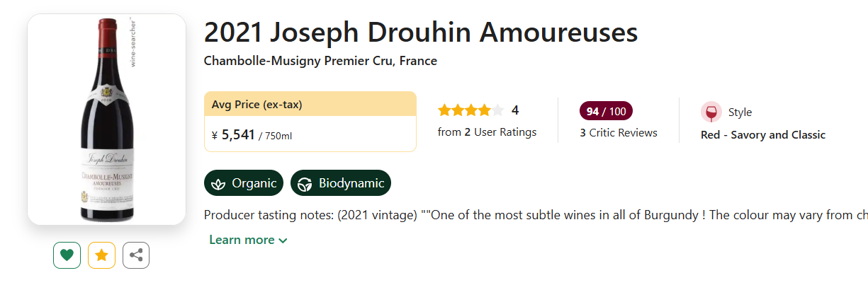 【低均近550!勃艮第百年名家,超一级园“爱侣园”!】Joseph Drouhin Amoureuses, Chambolle-Musigny Premier Cru 2021