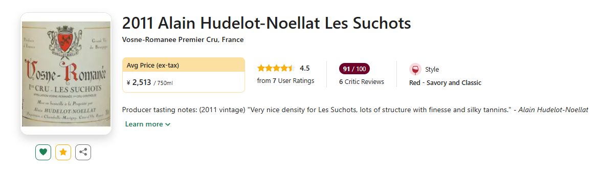 这款2011年份的Vosne-Romanee超一级园Les Suchots,产区优年加持下,拿下TA 94好评推荐!低均超200元的好价献上,勃艮第老饕们拼手速啦!
