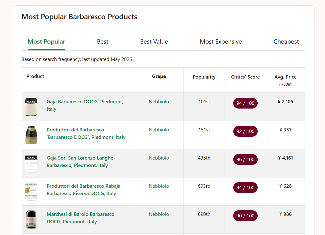 要问这款酒有多火,直接看Wine Seacher的Barbaresco产区MOST Popular排行榜(截止2025.5月上旬),全产区排名第二!