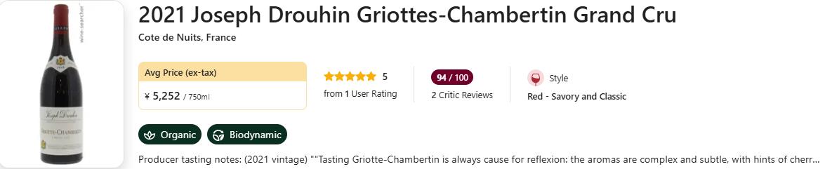 【低均1600+!勃艮第百年大名家,优年飘逸特级园!】Joseph Drouhin Griotte-Chambertin Grand Cru 2021