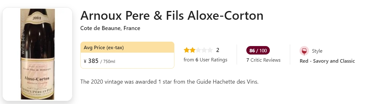 【白菜价勃艮第!直给的甜美,国均7.7折超高性价比!】Arnoux Pere & Fils Aloxe-Corton Rouge 2020