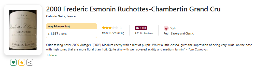 曾将葡萄出售给Joseph Drouhin、Leroy和Jadot等大名家,在Gevrey-Chambertin坐拥众多优质地块的翘楚Frederic Esmonin带着招牌Ruchottes-Chambertin“钢裤”来啦!