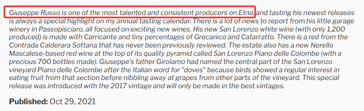Girolamo Russo酒庄由WS年度种植师Giuseppe Russo掌舵,其被WA大赞为Etna极有才华、品质极为稳定的酿酒师之一!