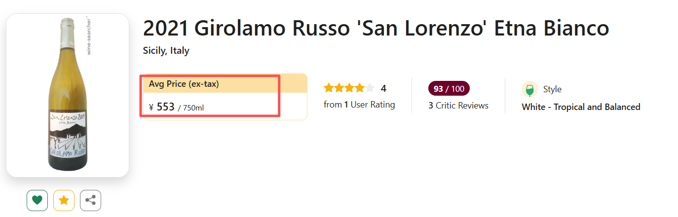 2021年份这款San Lorenzo招牌单一园,采用大比例近800米海拔、80年火山老藤Carricante酿造!这里有着富含矿物质的火山沙质土壤,使得出品酒款既丰满又细腻,极能表现骨架和力量感!