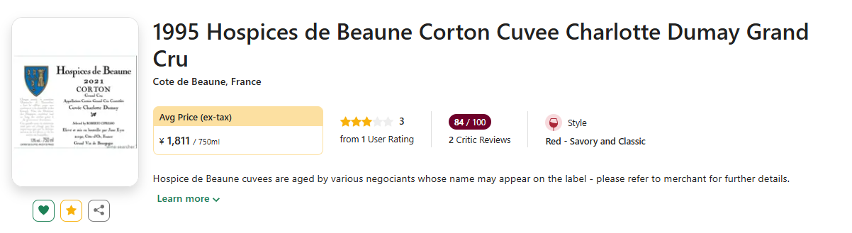 【国均8.8折!“济世之酒”,绝版老年份科通特级园!】Hospices de Beaune Corton Cuvee Charlotte Dumay Grand Cru (Dominique Laurent) 1995