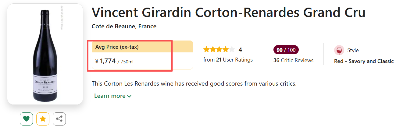 AM四星名家,勃艮第当红炸子鸡PVG老爹的酒庄Vincent Girardin出品,来自酒庄配额很少的Corton特级园精华地块Renardes!
