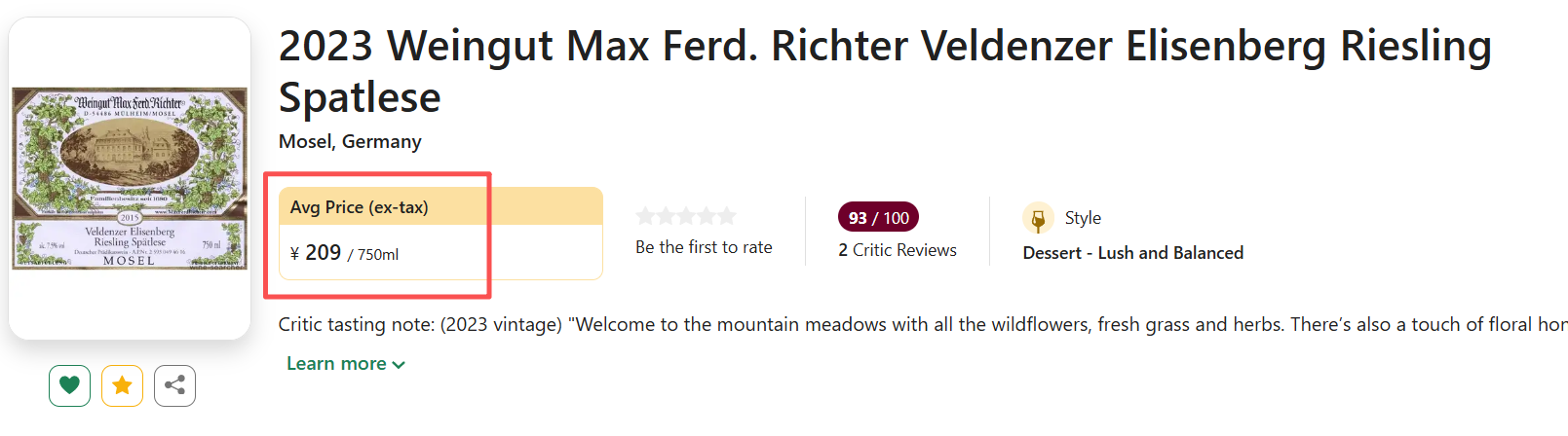 这款Spatlese采用来自Elisenberg葡萄园的70年老藤葡萄酿制;该葡萄园出品的酒,早在19世纪末便已与Brauneberg、Piesport、Wehlen村的名园以及Scharzhofberg齐名,曾亮相柏林与伦敦的皇家宴席!