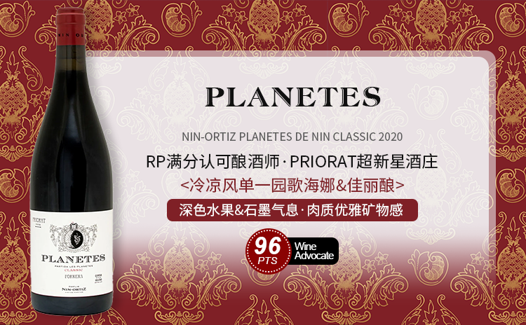 泛着石榴红光泽的深红色;饱满的黑樱桃与草莓果酱芬芳,交织着可可与香草气息;丝绒般柔顺,单宁结构精良,余味持久悠长。