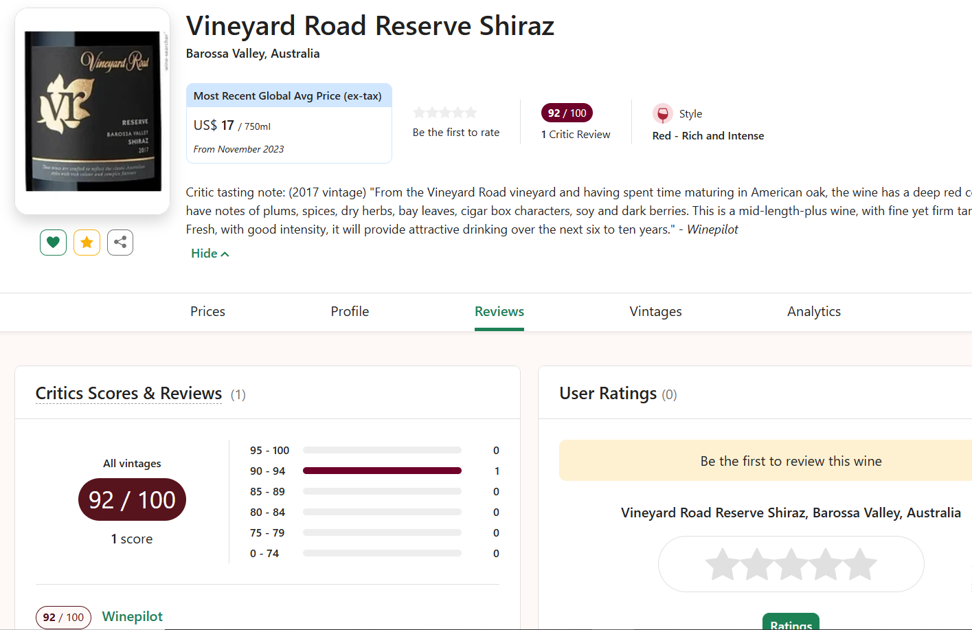 Vineyard Road Barossa Reserve Shiraz 2017,截图于Wine Searcher,11月上旬