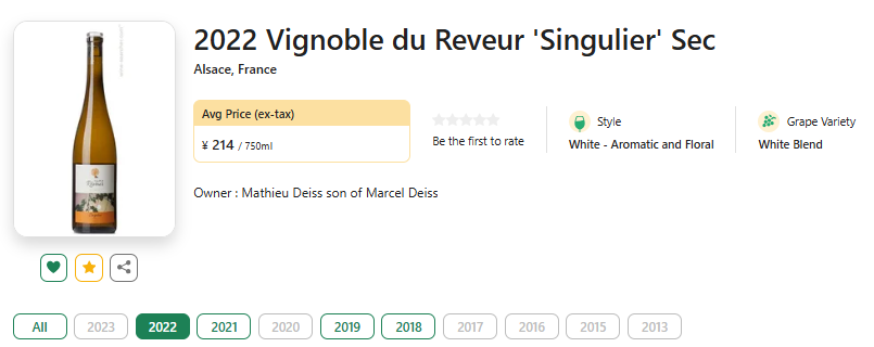 【国均9.1折!Marcel Deiss少庄主出品 | 雷司令x灰皮诺双生芳香叠奏】Vignoble du Reveur Singulier 2022 酒云直采