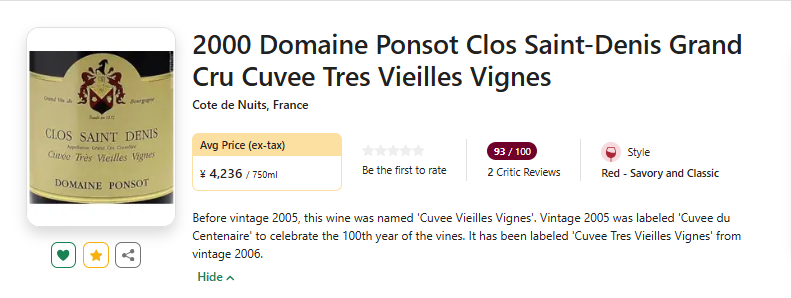 【低均200+!勃艮第膜拜彭寿,千禧大年,百年老藤钢裤!】Domaine Ponsot Clos Saint-Denis Grand Cru Cuvee Tres Vieilles Vignes 2000
