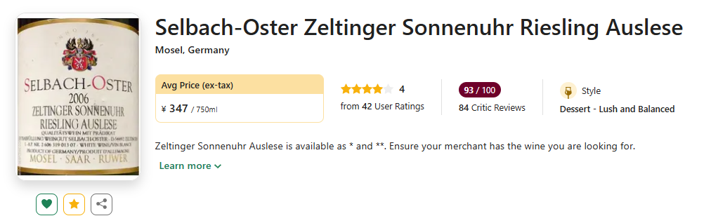 本次带来的是Zeltinger日晷园Auslese, 大年2019年份,斩获WA & WS 95、MFW & JS 94等名家高分!
