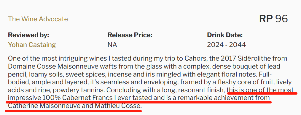 今天带来他家这款Siderolithe,被庄主Matthieu Cosse称为“一款令人惊艳的品丽珠!”往年曾斩获WA 96超高分盛赞:“是我品尝过至令人震撼的100%品丽珠佳酿之一,堪称Catherine Maisonneuve和Mathieu Cosse的非凡成就。”