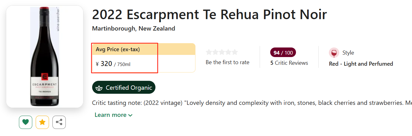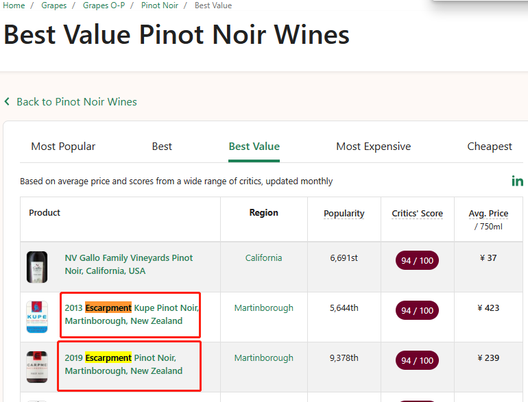 Wine-Searcher具性价比黑皮诺榜单,前三中Escarpment豪占两席