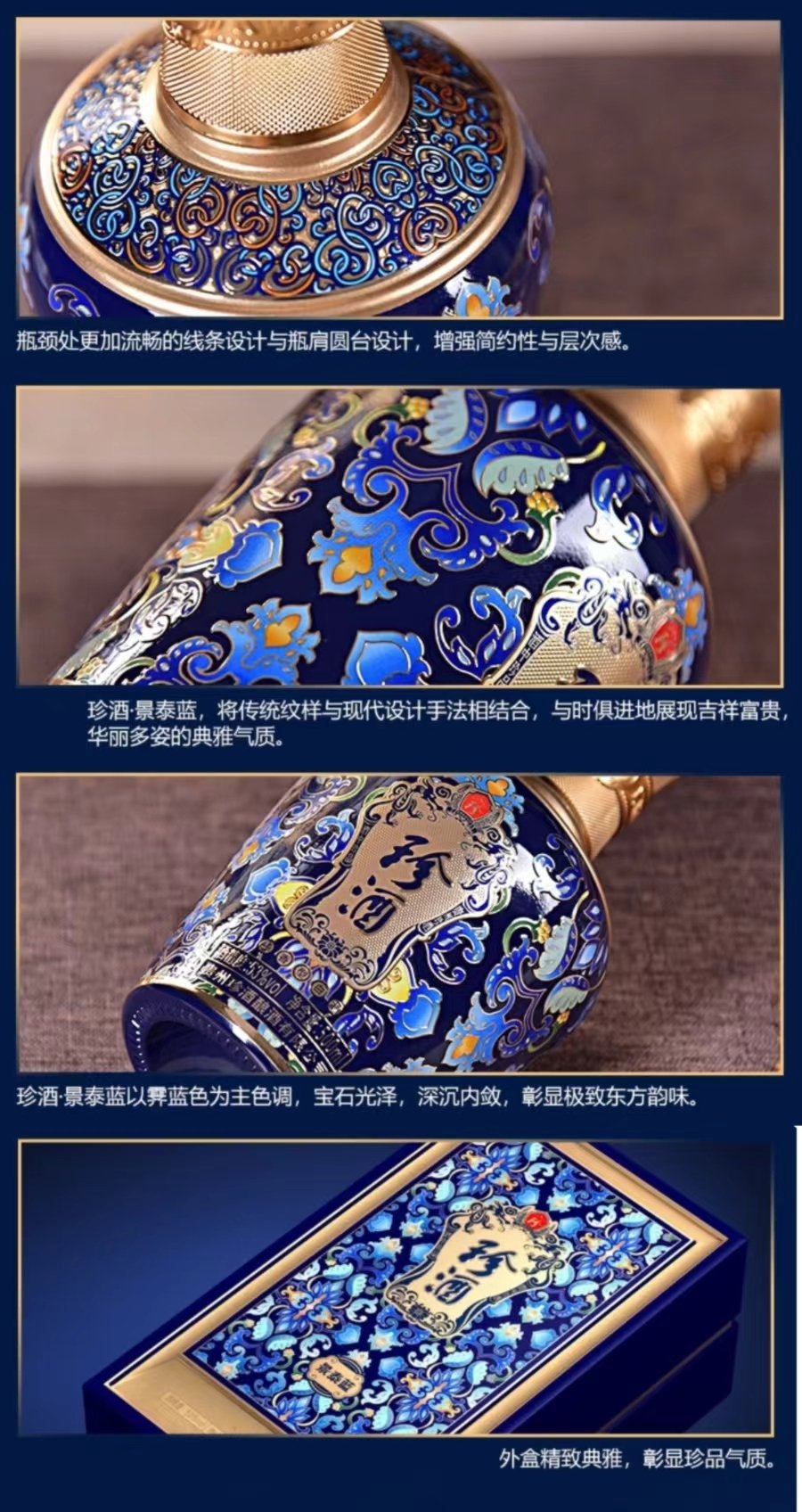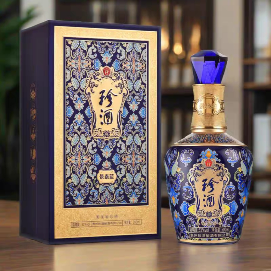 珍酒·景泰蓝选用不同年份珍藏老酒和优质基酒,由白酒国家级评委、珍酒第三代工匠吴长贵小批量勾调而成,未添加任何香气、香味物质。酒体微黄透明、酱香突出、陈香幽雅、圆润细腻、醇厚丰满、回味悠长、空杯留香持久。