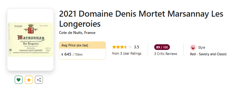 Vinous:2021年Marsannay Les Longeroies,熟化过程中使用了60%的新橡木桶,香气中带有一丝糖渍水果的甜美。酒体中等,单宁柔顺,矿物质感细腻,余韵精准而持久。美妙动人。