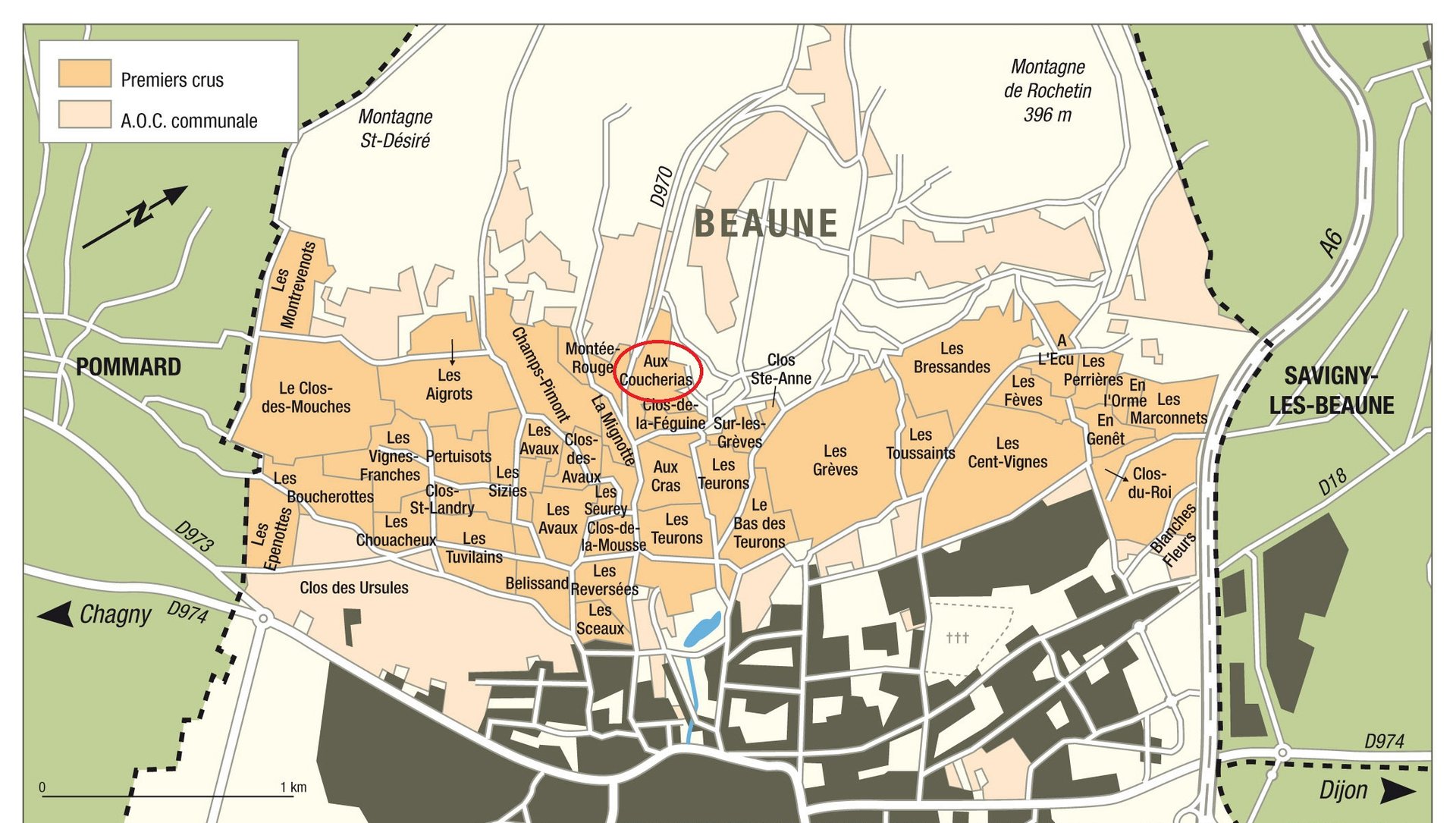 伯恩丘占据了丘陵中段的缓坡,而酒庄所在的上伯恩丘则位于更高处。更高的海拔使这里的黑皮诺往往很难成熟,因此好的葡萄园一般朝向西南。成熟度良好的黑皮诺会呈现出更纤瘦的酒体,风味也相对清淡且多了几分酸红果的味道。Aux Coucherias就是伯恩优质一级园之一,位于伯恩村一级园主产区带的中部Les Mondes Rondes山坡上,葡萄园朝向为西,面对着太阳落下的方向,地势非常陡峭。酒庄所拥有的地块种植于20世纪50年代,园内葡萄藤藤龄超60年。土壤主要以石灰石和粘土为主,所以孕育出的葡萄酒单宁质地极为紧密。