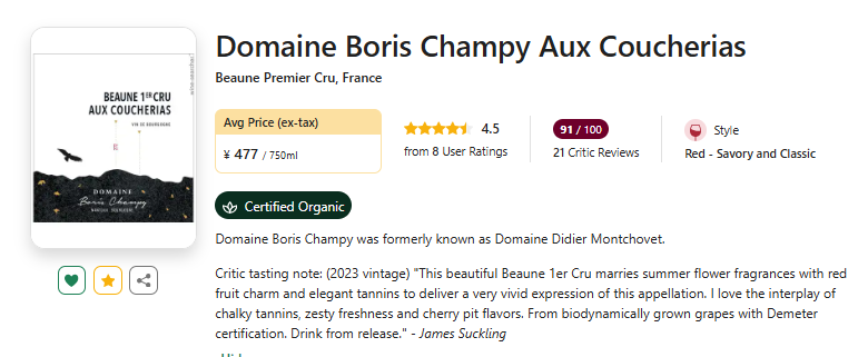 【爆降150!国均6.3折!勃艮第生动鼻祖,老藤伯恩一级园!】Domaine Boris Champy Beaune 1er Cru Aux Coucherias 2017