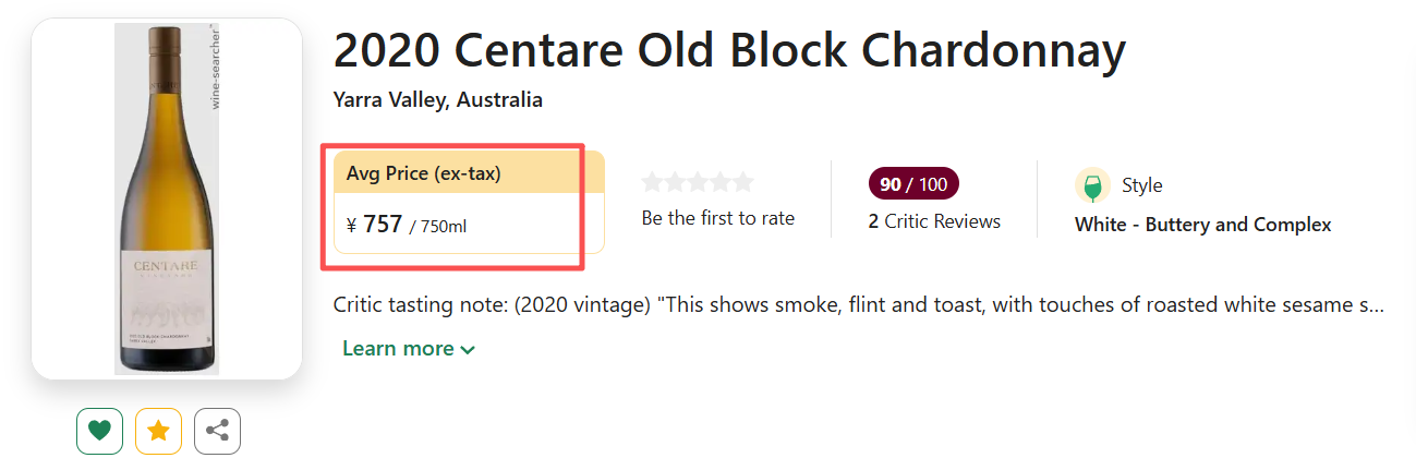 【国均5.3折&完爆澳洲本土价!JH准红五星庄,“非常勃艮第”旗舰霞多丽!】Centare Old Block Chardonnay 2020
