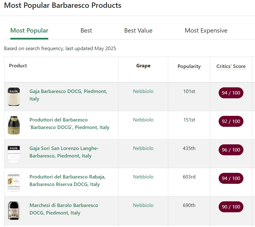 Wine searcher Barbaresco产区至流行酒款截图,前PDB Barbareco高居第二