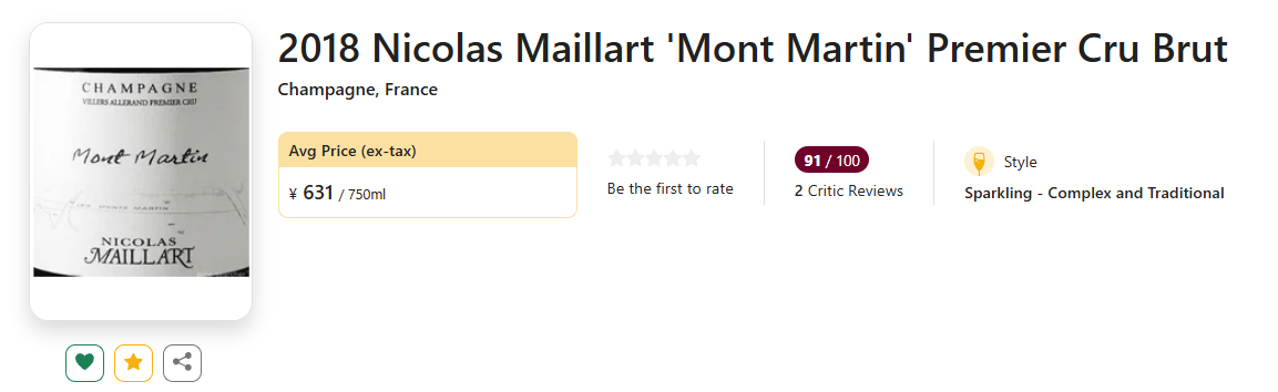 【国均7.9折!莫尼耶香槟中很难有性价比超过它的!】Nicolas Maillart 'Mont Martin' Premier Cru Brut 2018