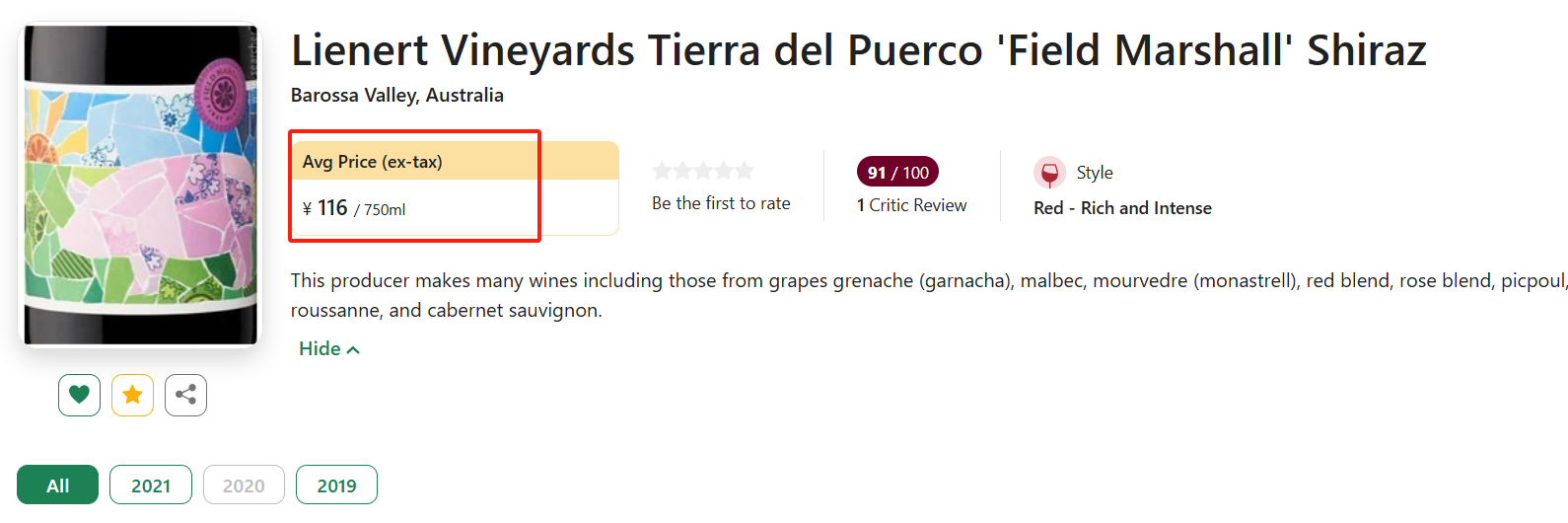 TWF:这款酒令人愉悦。它花香四溢,果香浓郁,易于接受,却又拥有深邃的黑色浆果风味。胡椒和李子的风味占据主导地位,但也能感受到一丝木烟的余韵,以及更明亮的覆盆子和花束的香气。这是一款非常优秀的葡萄酒,堪称价值典范。