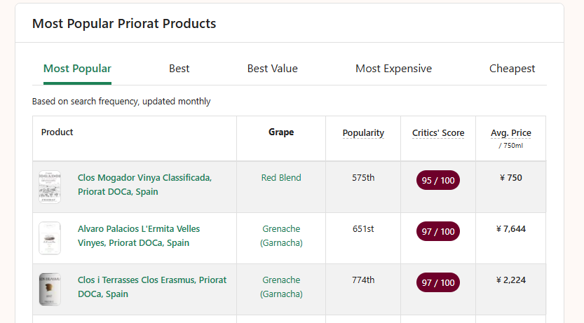 传统的Priorat红葡萄酒常为单一的歌海娜和佳丽酿,然后现代一般为这两者混合后与其他法国品种赤霞珠、美乐和西拉形成混酿型的葡萄酒。葡萄酒风格非常浓郁饱满,热情奔放,又不缺乏足够的精致和优雅。